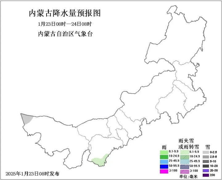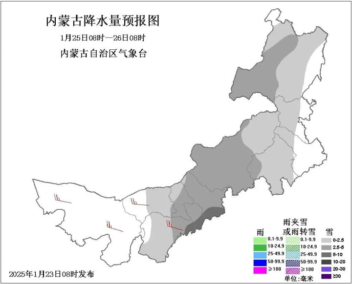 预计,今天(1月23日),内蒙古大部仍是一片暖意,西部大部及东部偏南局地最高气温可达5℃以上。不过,明日至27日,今年首场寒潮携大范围雨雪来袭,全区大部有小雪或雨夹雪,多地有中雪,西中部偏南部分地区将现大雪。同时,全区降温显著,西中部地区降温更为剧烈,部分地区累计降温16℃以上,多地气温将创入冬以来新低,时值春运高峰期,公众出行请做好防寒保暖措施,路途中注意交通安全。